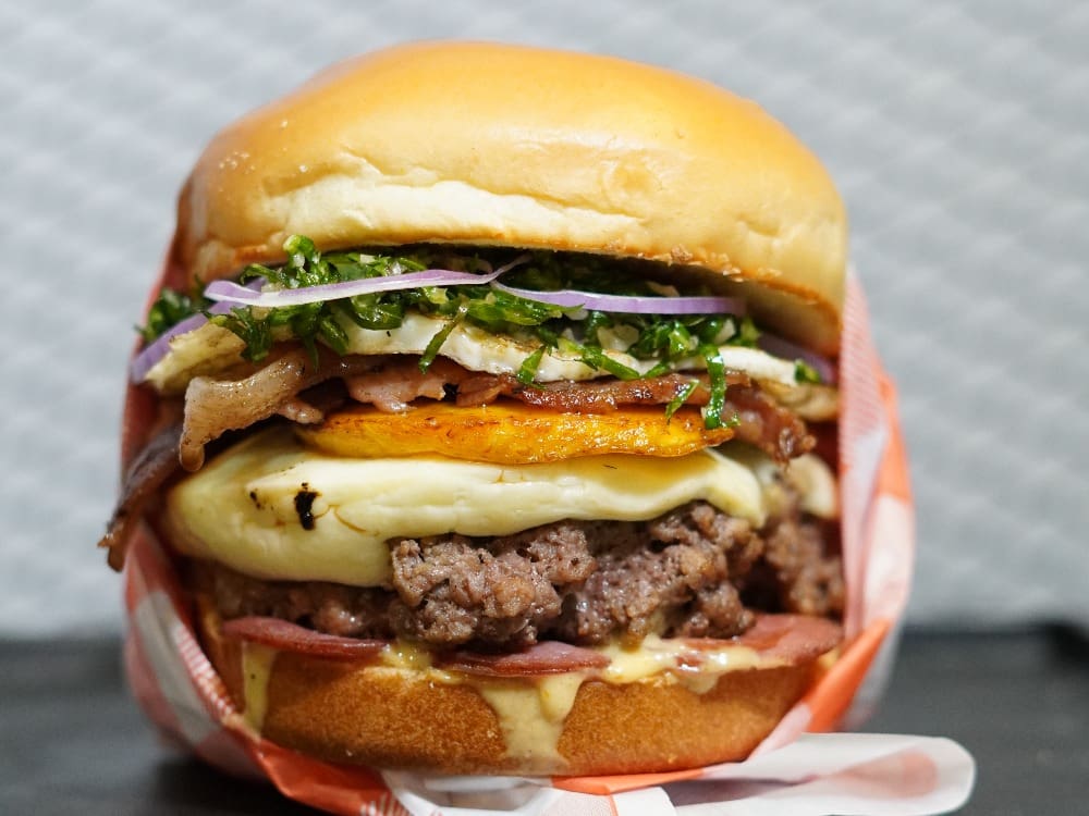 Delicioso lanchje feito com Blend de 150g, calabresa, queijo minas, bananas Fritas, ovo, bacon em fatias, molho do Chef, couve refogado e Cebola roxa.