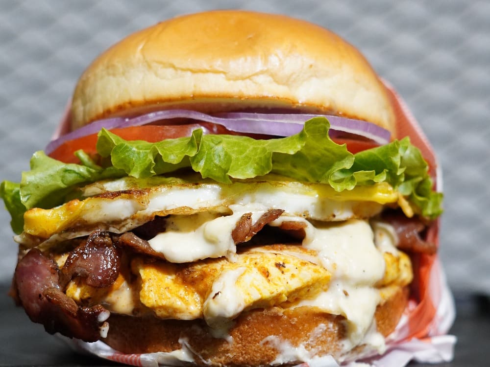 Delicioso lanche feito com Blend de Frango de 100g, ovo, creme de queijo, bacon, molho do chef, cebola roxa e salada