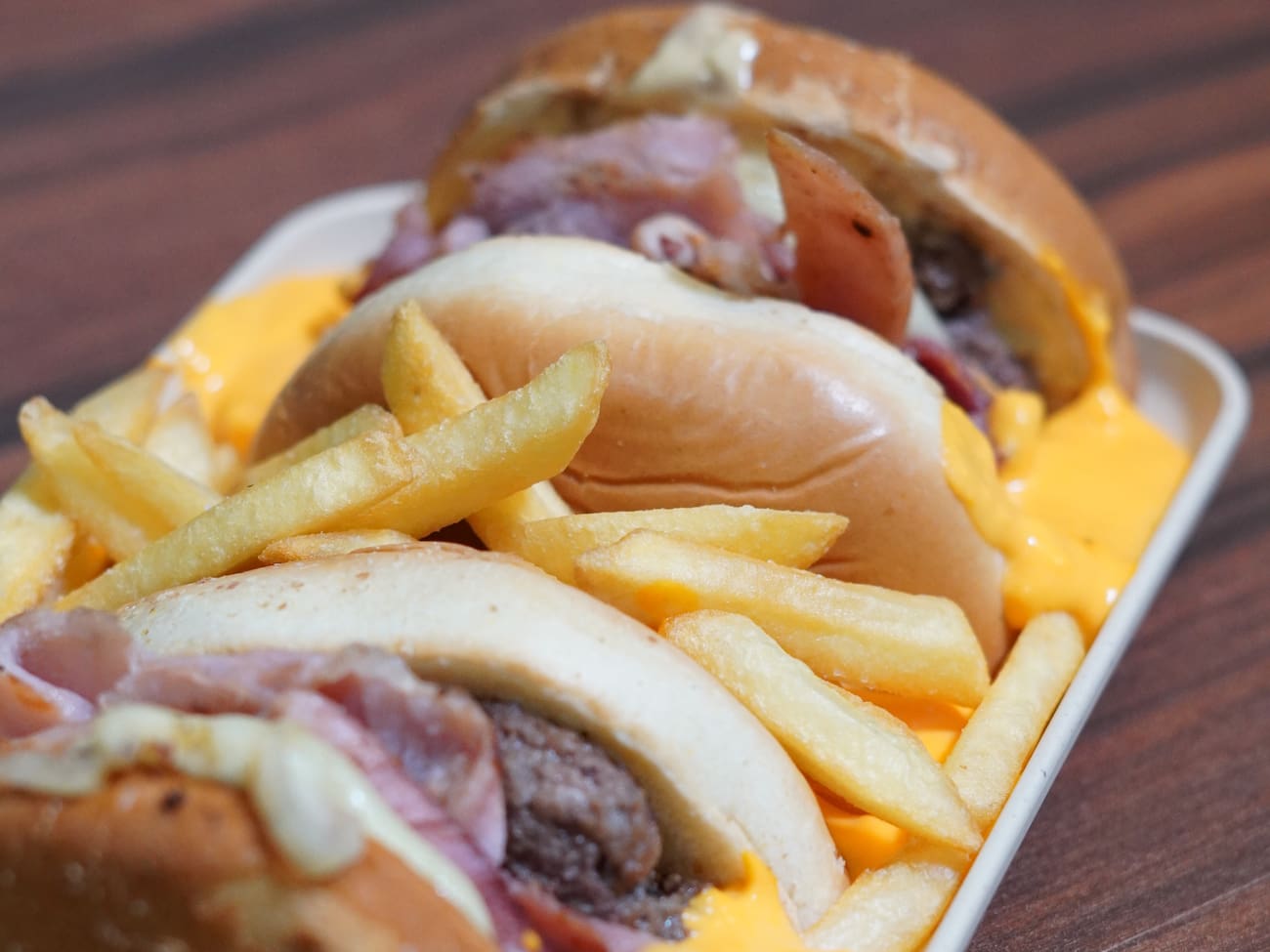 Deliciosos 2 Blends de 100g, Muçarela, Molho do Chef, Bacon em fatias....Tudo isso mergulhado em uma piscina de Cheddar, acompanhada de 100g de batata fritas!