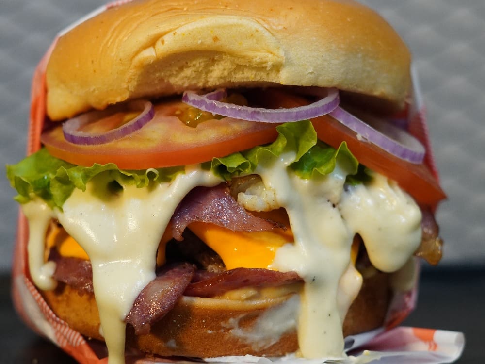 Delicioso lanche feito com 2 blends de 100g, 2x cheddar, bacon em Fatias, molhos do Chef, picles, cebola roxa e salada.